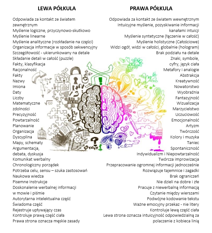 W realnym świecie trudno przeżyć tylko z jedną funkcjonującą półkulą. Obie uczestniczą w procesach psychicznych, chemicznych, a mózg scalając w całość odbierane bodźce, przyspiesza procesy poznawcze i usprawnia funkcjonowanie człowieka w każdym aspekcie życia. Pomimo że półkule pracują rozdzielnie, ich jednoczesne działanie gwarantuje bogactwo doświadczeń. Wnoszą one swoje plusy i minusy w przeżywanie, pracę zawodową, badawczą, rozwojową, twórczą i codzienną egzystencję. Preferowanie jednej z nich tylko zuboża i ogranicza człowieka. Ludzie myślący wyłącznie analitycznie, logicznie, wykorzystujący schematy i cyfry, nie mają fantazji, brak im polotu i kreatywności. Wytwór ich umysłu jest precyzyjny, klarowny, surowy i nudny. Z kolei ci, którzy bujają w obłokach z głową pełną oryginalnych, nowatorskich pomysłów, nie potrafią ich wyrazić, nadać im struktury, formy, a tym samym zrealizować. Ich wizja jest bajecznie piękna, genialna, ale pozostaje tylko wizją. Rozwijanie obu półkul należy prowadzić świadomie i uważnie. Zdarzają się ludzie, u których obie półkule są naturalnie zrównoważone – rozwinięte w typ samym stopniu. Wykazują się wieloma wszechstronnymi talentami – zarówno uzdolnieniami matematycznymi, jak i artystycznymi. Osoby takie często mają poczucie, że w ich głowie żyją dwie osoby jednocześnie, z których każda chce być najważniejsza i najlepsza. Pomimo swojej wyjątkowości, rzadko odnoszą spektakularne sukcesy, ponieważ muszą radzić sobie z problemem upływającego czasu i zmusić siebie do przypisania priorytetów swoim celom. Nie jest to jednak takie proste, gdyż wszystko w równym stopniu ich interesuje, wszystkiemu chcą się poświęcić, wszystko zrobić, co nie jest to możliwe do zrealizowania w ciągu jednego ziemskiego życia. Harmonia następuje wtedy, kiedy obie połówki dopełniają się i współpracują ze sobą dla dobra człowieka, służąc mu w osiąganiu jego celów.