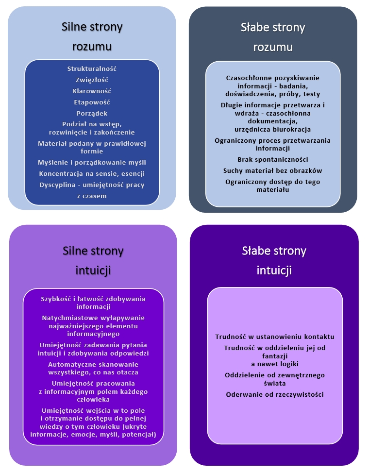 Logika posługuje się pięcioma kanałami informacyjnymi – wzrok, słuch, smak, węch, dotyk. Intuicja wykorzystuje inne kanały – jasnowidzenie, sensoryczność, uczuciowość, skanowanie, praca z podświadomością.